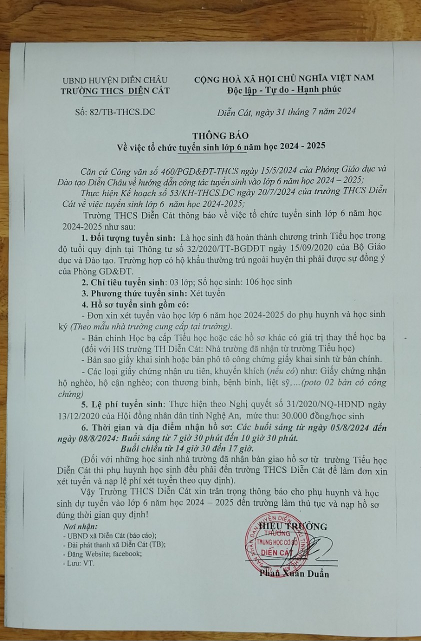 Thông báo về việc tuyển sinh lớp 6 năm học 2024 - 2025 của trường THCS Diễn Cát